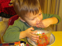 Then we made graham cracker shacks - which turned into wide open snowscapes for most of us. The icing, bless its heart, would not harden, so Abby's first attempt at a standing residence fell flat - pun totally and completely intended! - so we decided to shoot for an open field of snow to decorate. I started working on a nice scene, my story all coming together in my mind. Then little nephew Will liked what he was seeing and joined in. Suddenly I was making up all sorts of implausible stories for the various additions, and I had more mini gummy bears and sour patch kids than I planned and the populating of the little village I had resigned to him starting got way out of hand.